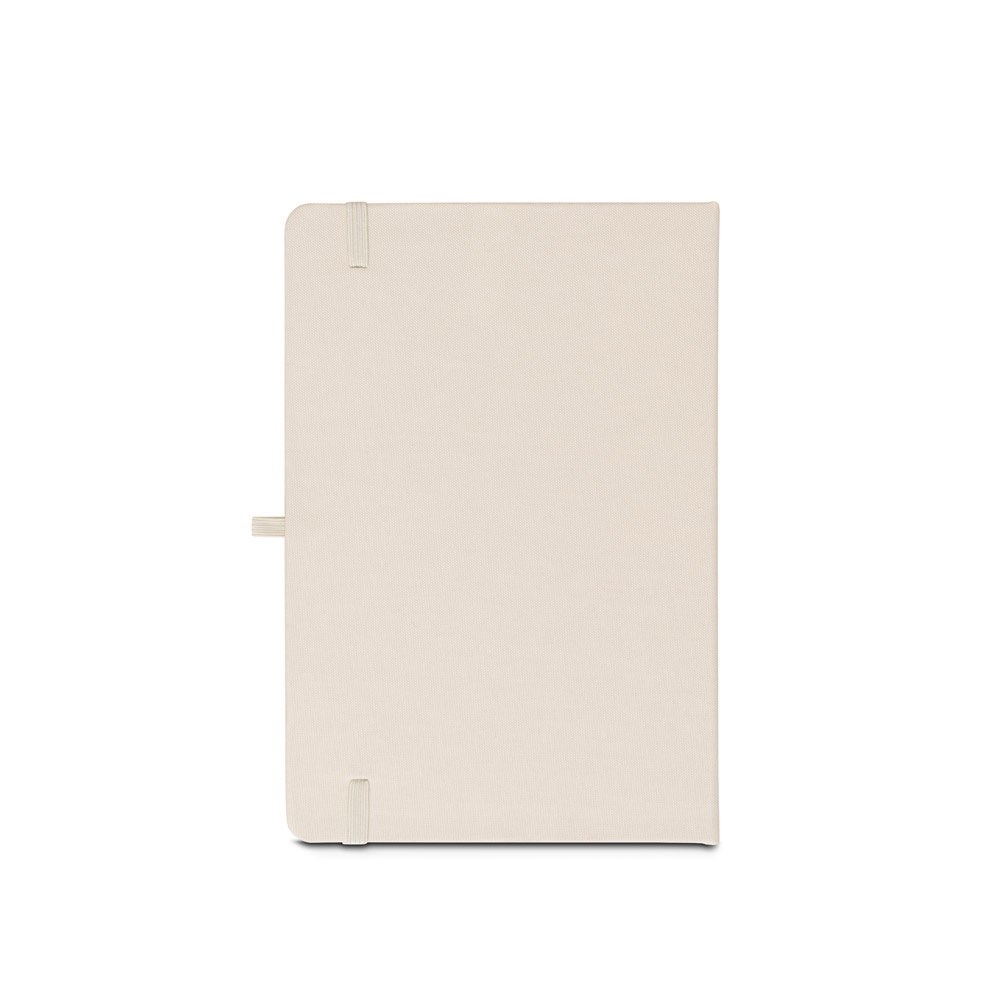 Bloco de notas A5, com capa rígida em poliéster reciclado (100% rPET) 300D e cantos redondos. Contém 160 páginas pautadas em papel cor de marfim 100% reciclado, fita separadora, suporte para esferográfica (não incluída) e elástico para fecho. Na parte inferior da lombada, tem impresso a branco o símbolo do rPET. 143 x 211 mm
