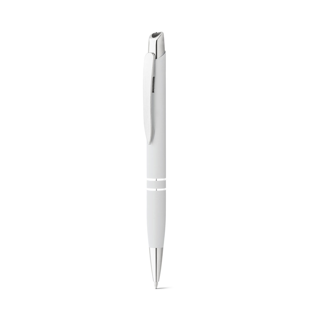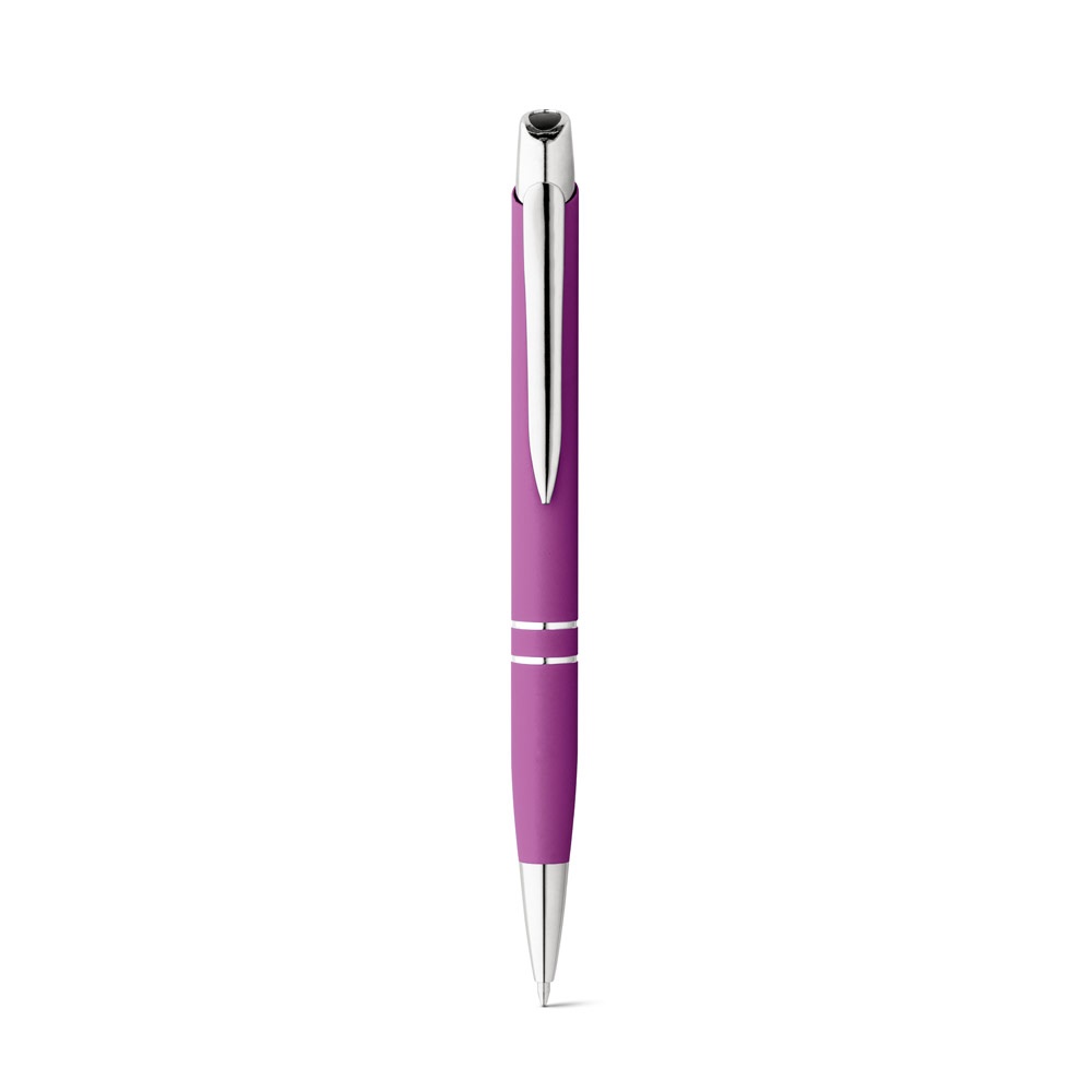 Esferográfica em alumínio com acabamento em borracha e com clipe. Disponível numa variada gama de cores. Escrita a azul. ø11 x 139 mm