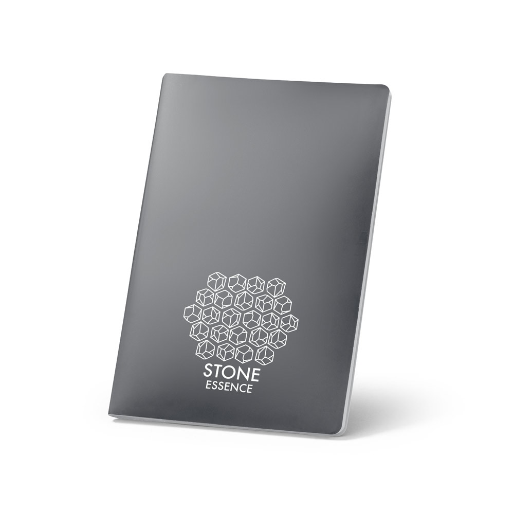 Bloco de notas A5 com capa flexível em papel 100% pedra (620g/m²), resistente à água. Contém 128 páginas brancas lisas (120g/m²). 140 x 210 mm