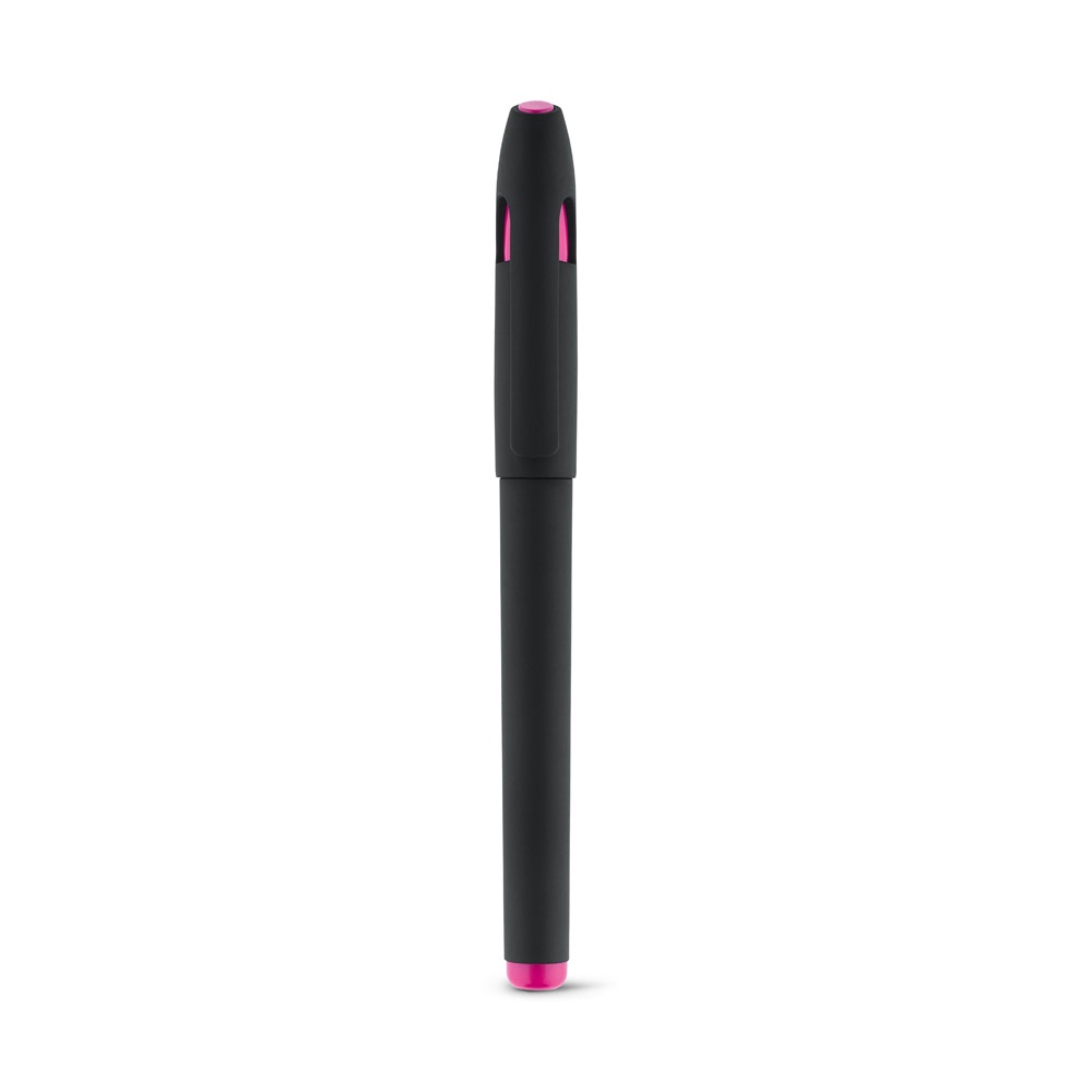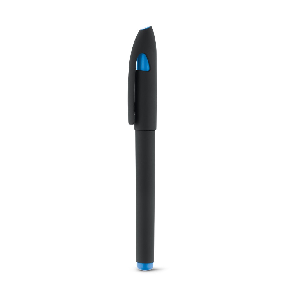 Esferográfica com tampa e clipe em ABS e acabamento em borracha. Esferográfica com detalhes com cor e antideslizante. Recarga a gel de escrita a preto. ø13 x 143 mm